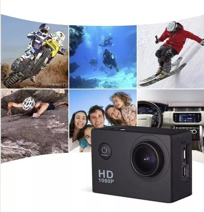 Cámara deportiva de acción con carcasa impermeable, te permite filmar 30 metros bajo el agua, resistente a golpes y caídas, pantalla de alta definición que muestra y reproduce fascinantes vídeos grabados, incluye muchos accesorios, adecuados para diversas situaciones, moto, natación, bicicleta, equitación, etc.Batería desmontable para un fácil reemplazo y ayuda a prolongar la vida útil del producto, descubre más detalles gracias a la nueva pantalla de 2” manteniendo aquellas características increíbles como conexión Micro-USB o la ranura Micro-SD para tarjetas de hasta 32GB (SD no incluida) POR TU COMPRA RECIBES:1 x Cámara deportiva resolución 1080 P1 x Batería1 x Soporte para manubrio de moto o bicicleta1 x Soporte para casco de moto o bicicleta1 x Soporte con rosca para trípode1 x Carcasa a prueba de agua1 x Guía rápida1 x Cable USBNOTA; SE ENVIA EN COLORES ALEATORIOSPOLÍTICA DE GARANTÍA:Orden incompleta / Producto diferente / Producto averiado: En caso tal de recibir la orden incompleta o recibir un producto diferente al solicitado por la tienda, o roto se reenviará uno nuevamente sin ningún costo de flete. Cuenta con 10 días para solicitarlo. La garantía será valida para los siguientes casos:Orden incompletaMal funcionamientoProducto rotoOrden diferenteMal funcionamiento: Todos nuestros productos cuentan con garantía, en caso de presentar una falla el producto será cambiado siempre y cuando no se compruebe que haya sido por un mal uso por parte del cliente. Para este caso el periodo es de 30 díasNOTA: ESTE PRODUCTO NO ES ORIGINAL, ES GENÉRICO