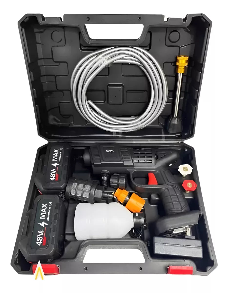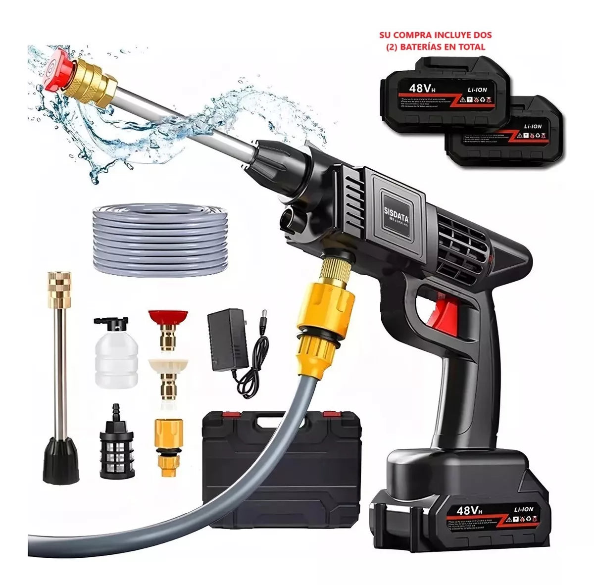 💦 Hidrolavadora Portátil Inalámbrica 48V con Doble Batería 🔋¡Limpieza poderosa sin cables!Esta hidrolavadora inalámbrica es ideal para limpiar autos, motos, jardines, fachadas y mucho más. Potente, portátil y práctica: perfecta para el hogar o para llevar donde la necesites.🚀 Características Técnicas:Materiales: ABS y cobre de alta resistenciaPresión máxima: 60 BarVelocidad del motor: 20.000 rpmFlujo de agua: Hasta 10 litros por minutoPotencia: 400WLargo de manguera: 5 metrosAlcance del chorro: 6 a 10 metrosFuente de agua: Recipiente mínimo de 30L⚙️ Funcionamiento:Impulsión: Inalámbrica (batería de litio de 48V)Incluye: 2 baterías de litio recargables + cargadorAplicaciones: ▪ Lavado de autos, motos y bicicletas ▪ Riego de flores y pequeños cultivos ▪ Limpieza de baños, fachadas, pisos, terrazas y más📦 Contenido del paquete:Hidrolavadora portátil2 baterías de 48VCargadorManguera de 5 metrosFiltro de aguaBotella espumadoraBoquillas intercambiablesAccesorios de conexiónMaletín de transporte✅ Recomendaciones de uso:Llena la manguera completamente antes de encender la máquina.Coloca el balde de agua mínimo a 1 metro de altura para mayor presión.Úsala en ciclos de máximo 5 minutos para evitar sobrecalentamiento.Carga la batería hasta que el LED del cargador se ponga verde.
